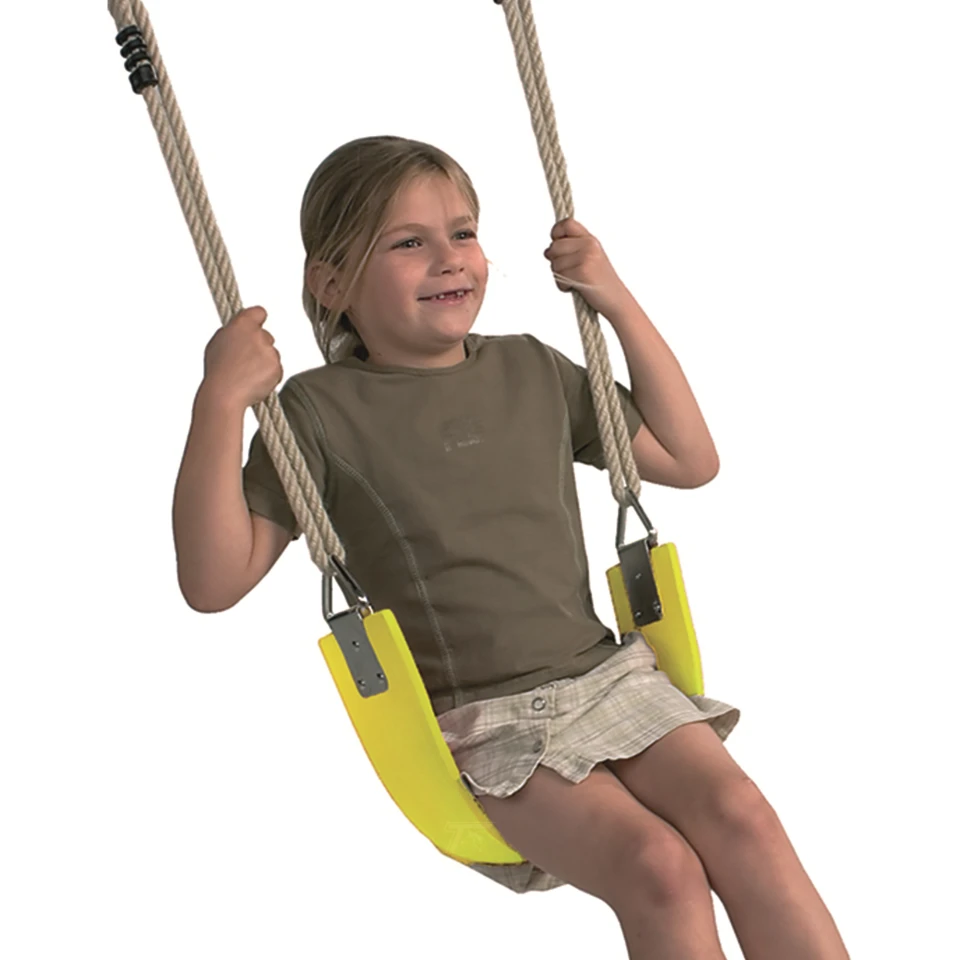 Deze gele lintschommel is bedoeld om te bevestigen aan een speeltoestel. Deze speeltoestellen kunt u ook vinden in onze webshop!