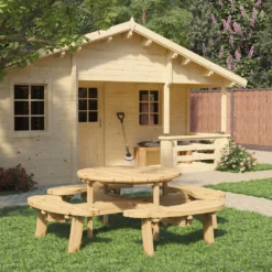 Deze mooie, geïmpregneerde vuren Picknicktafel Rond heeft een diameter van 219 cm en een hoogte van 73 cm. Het tafelblad heeft een diameter van 119 cm. Hierdoor is deze picknicktafel zeer geschikt om met een grote groep mensen aan te gaan zitten op mooie zomerdagen.