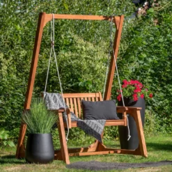 In deze houten schommelbank kunt u alleen of met een ander genieten van de zomerzon. De bank hangt met een stevig touw aan de hardhouten constructie en is daarmee niet alleen stevig maar ook zeer modieus. Wanneer u een mooie toevoeging aan uw tuinmeubilair wilt kopen, kies dan voor dit prachtige, duurzame product.
